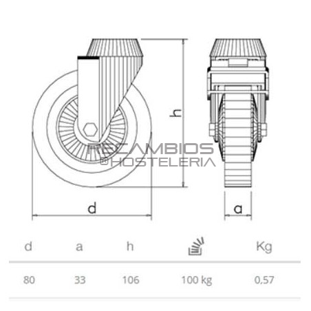 Ruedas de Nylon económica, con estructura Inoxidable y base rodante en Nylon. Duración y resistencia garantizada, ideales para mesas, maquinaria, carros en mataderos, salas de despiece y demás sitios donde el grado de humedad es elevado. Diámetro de la rueda: Ø 80 mm